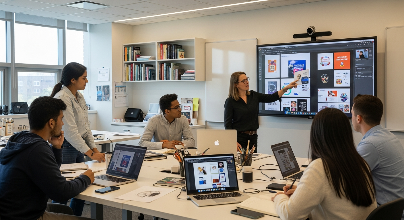 Dizaino išsilavinimas vizualinės komunikacijos srityje paprastai apima teorines žinias ir praktinį mokymą. Studentai mokosi naudotis profesionalia programine įranga, tokia kaip „Adobe Photoshop“, „Illustrator“, „InDesign“ ir kitomis, skirtomis grafikai, skaitmeniniam menui ir maketavimui. Studijų metu lavinami įgūdžiai apima logotipų kūrimą, prekės ženklo identiteto formavimą, spaudos dizainą, internetinių svetainių ir mobiliųjų aplikacijų vartotojo sąsajos (UI) ir vartotojo patirties (UX) dizainą. Taip pat dėmesys skiriamas animacijai, video grafikai ir 3D modeliavimui, atsižvelgiant į šiuolaikines medijos tendencijas. Šios studijos padeda studentams išvystyti stiprius techninius gebėjimus ir unikalų kūrybinį mąstymą, reikalingą sėkmingai karjerai.